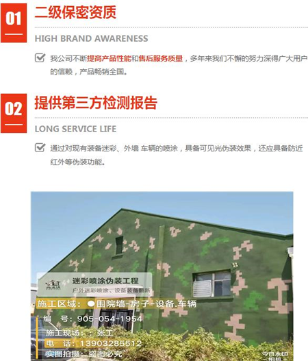 迷彩偽裝涂料漆、環(huán)保建材等領(lǐng)域,但外墻迷彩漆是一種特殊的涂料,主要用于提供防護(hù)和迷彩效果,具有耐候性強新產(chǎn)流程全程監(jiān)控